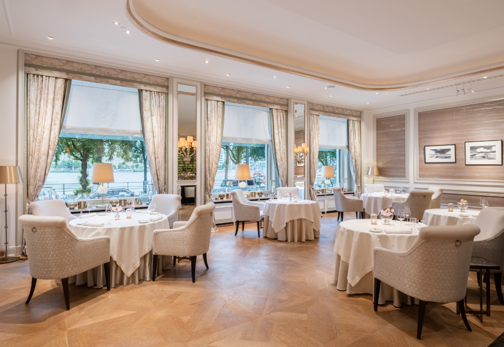 Restaurant Haerlin***, whose fame extends far beyond Hamburg's borders and which has been awarded 3 Michelin stars and 5 Gault-Millau toques, is also a feast for the eyes and the senses: Chinese silk wallpaper and gold embossing create a truly exquisite arrangement.