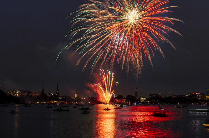 Colourful rockets and dazzling fireworks light up Hamburg's night sky at midnight to ring in the New Year. In addition to many small private fireworks displays, Hamburg also has a huge fireworks display that can be seen from almost anywhere. The fireworks over the River Elbe are particularly popular, as they are beautifully reflected in the water and illuminate Hamburg harbour. The best views are from the Landungsbrücken or the Elbphilharmonie Plaza.