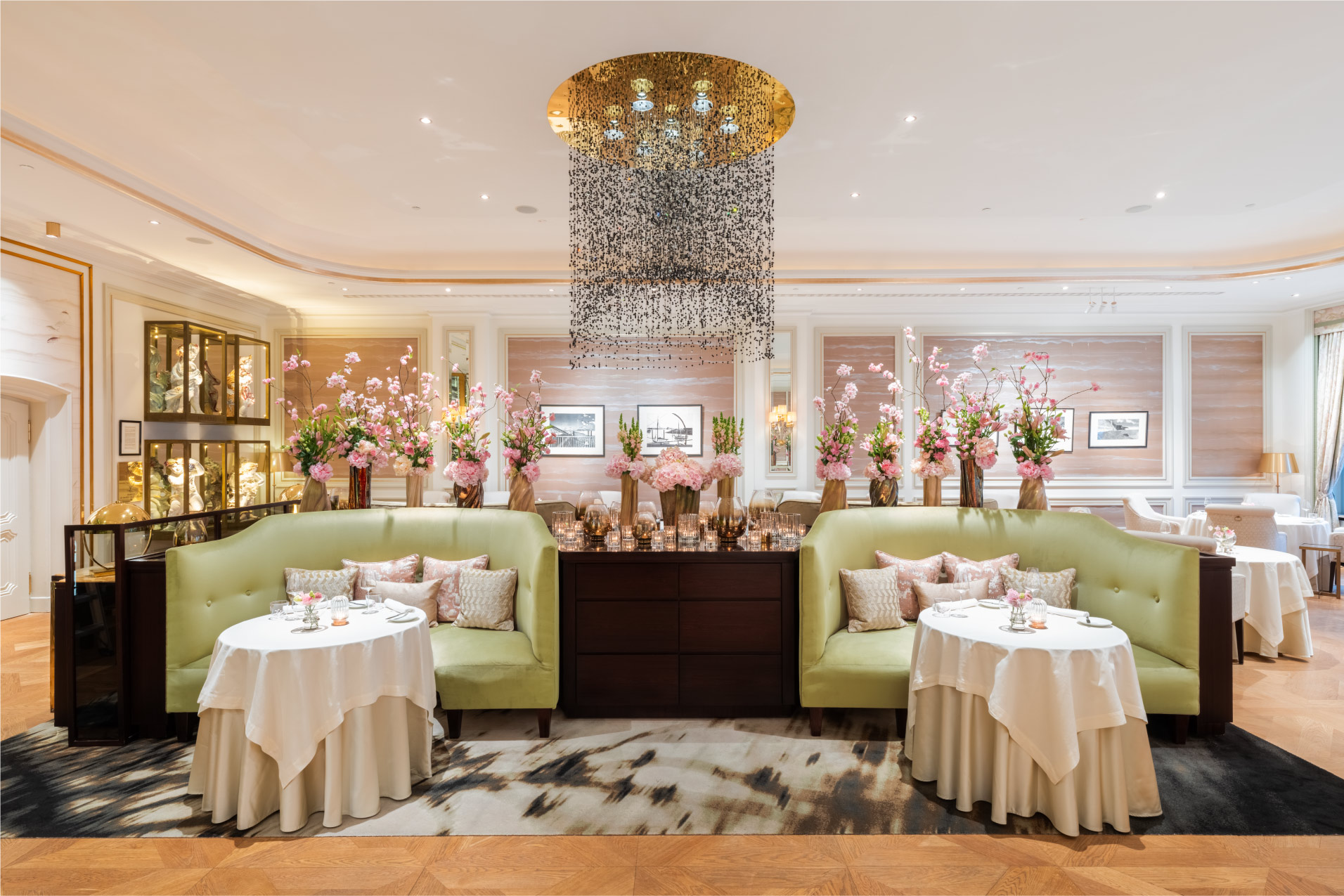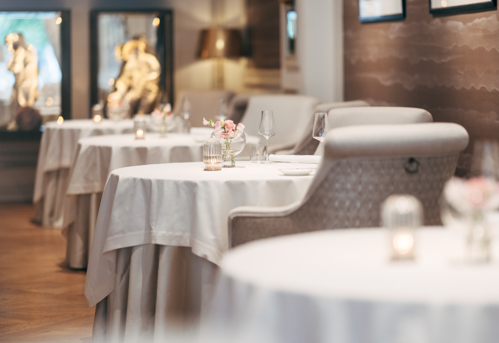 Restaurant Haerlin***, whose fame extends far beyond Hamburg's borders and which has been awarded 3 Michelin stars and 5 Gault-Millau toques, is also a feast for the eyes and the senses: Chinese silk wallpaper and gold embossing create a truly exquisite arrangement.